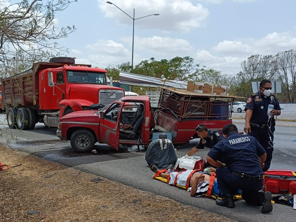Chófer de una camioneta se mete en el paso de un volquete y termina destrozado en el Periférico de Mérida