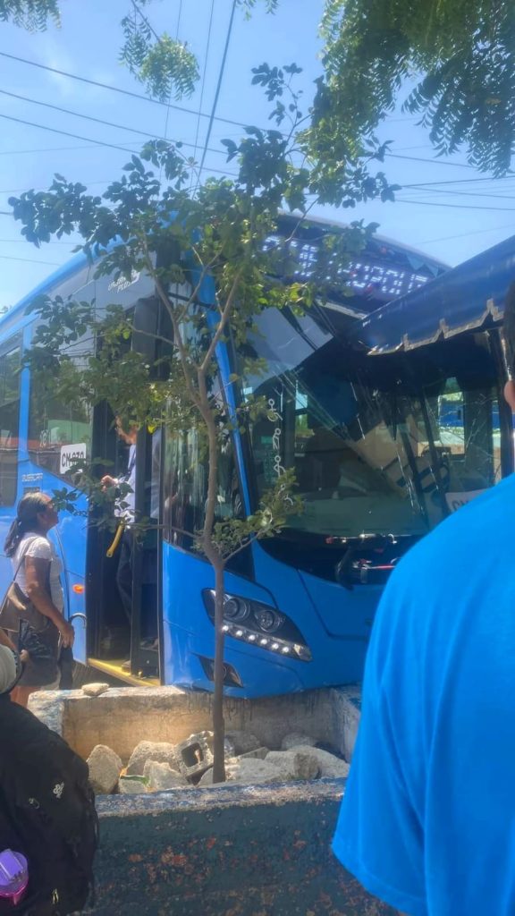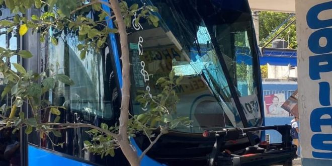 Mérida, Yuc., a 09 de mayo 2024.- Contra el arriate de una banqueta,de un comercio en la calle 79 con 108 de la colonia Nueva Sambulá, chocó la unidad CM030 de Va y Ven, luego de que el guiador, quien bajó un momento, olvidara poner el freno al vehículo.