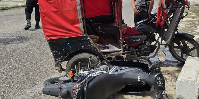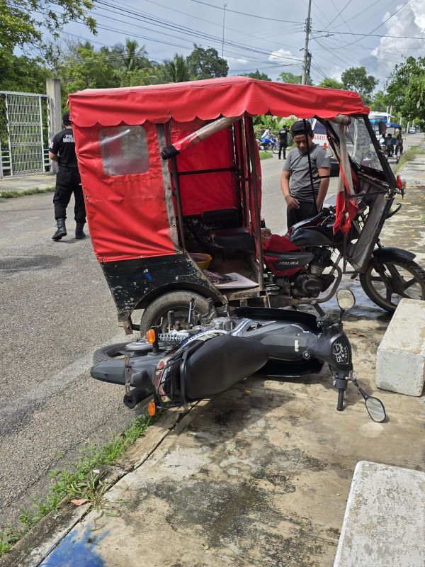 Kinchil, Yuc. a 02 de octubre 2024.- Una pareja de jóvenes que iba a bordo de una motocicleta se estrelló de costado con un adolescente mototaxista que pretendio dar vuelta en “U” con su ‘calesa’ en la calle 18 por 13 y 15 de esta población.