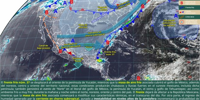 Se prevé la masa de aire frío que impulsó al frente frío No.37 se mantenga cubriendo la península de Yucatán, propiciando condiciones de cielo medio nublado a nublado, con probabilidad de lloviznas y chubascos en los tres estados de la región. El ambiente será cálido durante el día y fresco a templado al amanecer, con viento de componente norte-noroeste de 20 a 30 km/h y rachas mayores a 50 km/h en zonas costeras.
