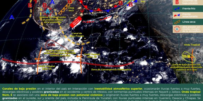 El dominio de un sistema de alta presión, continuará favoreciendo el ingreso de aire marítimo tropical hacia la región, y en combinación con el calentamiento diurno, se prevén condiciones de cielo despejado y nublados aislados con probabilidad para lloviznas e intervalos de lluvia sobre la porción noreste de Yucatán y norte de Quintana Roo, así como intervalos de chubascos con lluvias puntuales fuertes en el sur y suroeste de Campeche. Las temperaturas se mantendrán en rangos