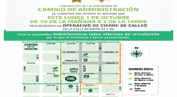Mérida, Yucatán.- A partir de las 10:00 horas de este lunes, la Secretaría de Seguridad Pública (SSP) aplicará un operativo vial por el cierre parcial de calles en el Centro Histórico de esta ciudad, con motivo del cambio de titularidad en el Poder Ejecutivo de Yucatán, por lo que se pide a quienes transitan por la zona a tomar medidas precautorias.