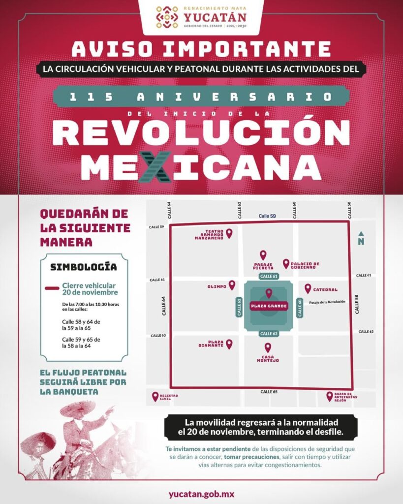 Mérida, Yucatán, a 20 de noviembre de 2025.- El Gobierno del Estado informa a la ciudadanía que, con motivo del desfile conmemorativo del 115 aniversario del inicio de la Revolución Mexicana, este jueves 20 de noviembre permanecerá cerrado el tránsito vehicular en diversas calles del Centro de Mérida.