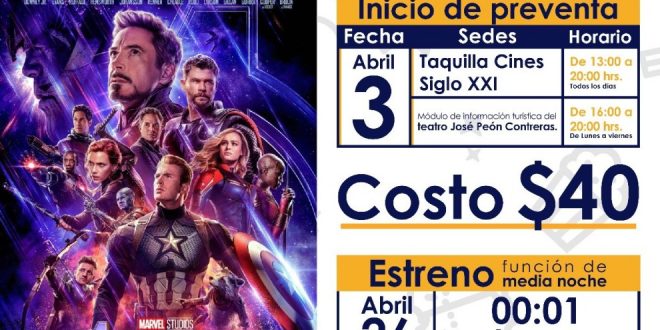 Mérida, Yucatán, 2 de abril de 2019.- Con función de medianoche y entradas a sólo 40 pesos para niñas, niños y adultos, el Patronato de las Unidades de Servicios Culturales y Turísticos (Cultur) proyectará el estreno de Avengers: Endgame, el próximo viernes 26 en los Cines Siglo XXI.