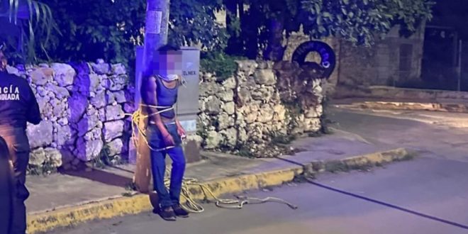 TIZIMÍN, Yuc., 12 de noviembre 2024.- Vecinos amarraron a un poste de madera de una empresa telefónica a un sujeto que descubrieron cuando intentaba robar en un predio de la calle 51 entre 30 y 32 de la colonia San José Nabalam.