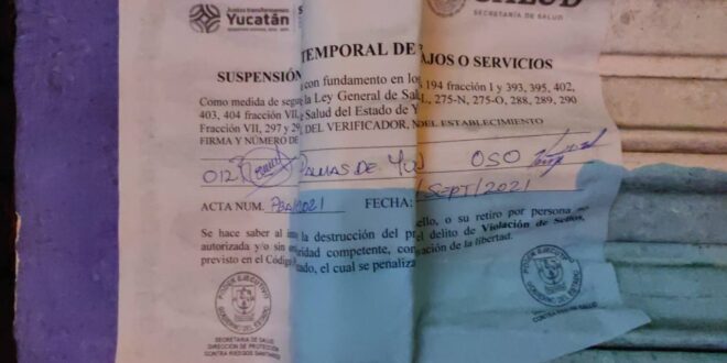 Mérida, Yucatán, 5 de septiembre de 2021.- Un bar ubicado en el centro de Mérida y un restaurant bar, localizado al sur de esta ciudad, fueron clausurados por personal del Gobierno del Estado debido a que incumplieron con los protocolos y medidas sanitarias correspondientes ante la pandemia del Coronavirus, por lo que podrían recibir una multa de hasta 180,000 pesos.