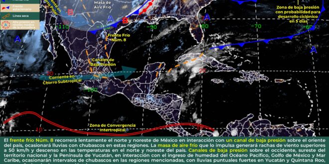 Se prevé que durante este día se presenten condiciones de cielo medio nublado a nublado principalmente en el oriente, centro y sur de la región, debido al ingreso de aire marítimo tropical en combinación con el establecimiento de un canal de baja presión sobre el sureste del país, lo que favorecerá la probabilidad para intervalos de chubascos con tormentas localmente fuertes principalmente a lo largo del estado de Quintana Roo y el oriente de Yucatán, mientras que para el centro y sur de Campeche se esperan lloviznas con chubascos dispersos. Las temperaturas serán cálidas a calurosas durante el día y de templadas a cálidas al amanecer, con viento del este-noreste de 10 a 20 km/h y rachas mayores a 35 km/h en zonas costeras.