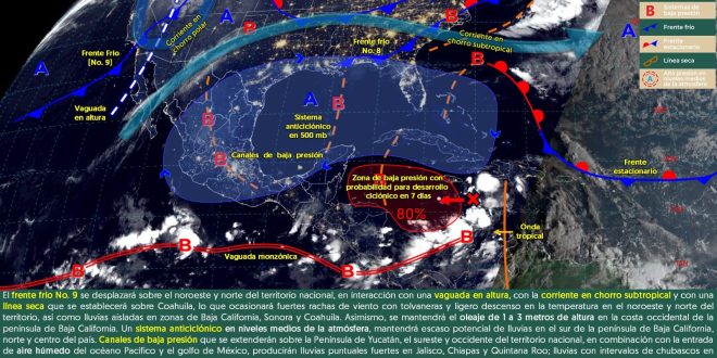 Se presenten condiciones de cielo despejado a parcialmente nublado, con probabilidad de intervalos de chubascos con tormentas aisladas en el centro y sur de Quintana Roo, así como lloviznas con chubascos aislados en Campeche y Yucatán, debido al ingreso de aire marítimo tropical, en combinación con el calentamiento diurno. El ambiente será cálido a caluroso durante el día y cálido por la noche. Vientos de componente noroeste de 15 a 25 km/h, con rachas mayores a 40 km/h en zonas costeras.
