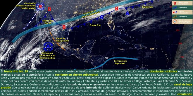 MÉRIDA, Yuc., 27 de enero 2025.- En las próximas 24 horas, se prevé cielo parcialmente nublado a nublado, con probabilidad de lluvias ligeras. Ambiente cálido a caluroso en el día y cálido a templado al amanecer.