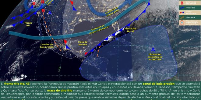 El desplazamiento del frente frío Núm. 43 sobre la península, mantendrá chubascos al sur de Quintana Roo, así como lluvias aisladas en el noreste de Yucatán y sur de Campeche. Además, de evento de “norte” con rachas alcanzando los 50 km/h. En cuanto al ambiente, este se tornará cálido a caluroso en el día y de fresco a