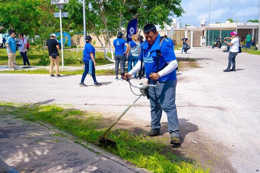 Mérida, Yucatán a 13 de julio de 2024. Vecinos del Acuaparque y voluntarios acompañaron a la alcaldesa electa de Mérida, Cecilia Patrón Laviada, a la limpieza y poda de áreas verdes, así como la fumigación y abatización de predios para evitar la proliferación de moscos en la zona.
