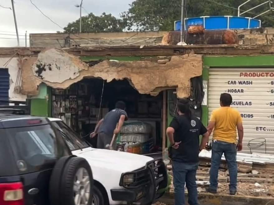 Mérida, Yuc. a 13 de julio 2024.- La fuerte lluvia que cayó ayer, más lo que dejaron tormentas pasadas, provocó que se derrumbaran las marquesinas o cornisas de varios locales comerciales en la calle 35 con 41 de la colonia San Juan Grande, a un costado del fraccionamiento Brisas.