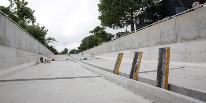 Mérida, Yucatán a 27 de octubre del 2021,- Para mejorar la seguridad al circular por el paso a desnivel de Prolongación de Paseo de Montejo, el Ayuntamiento de Mérida instaló luminarias e infraestructura urbana en la zona.
