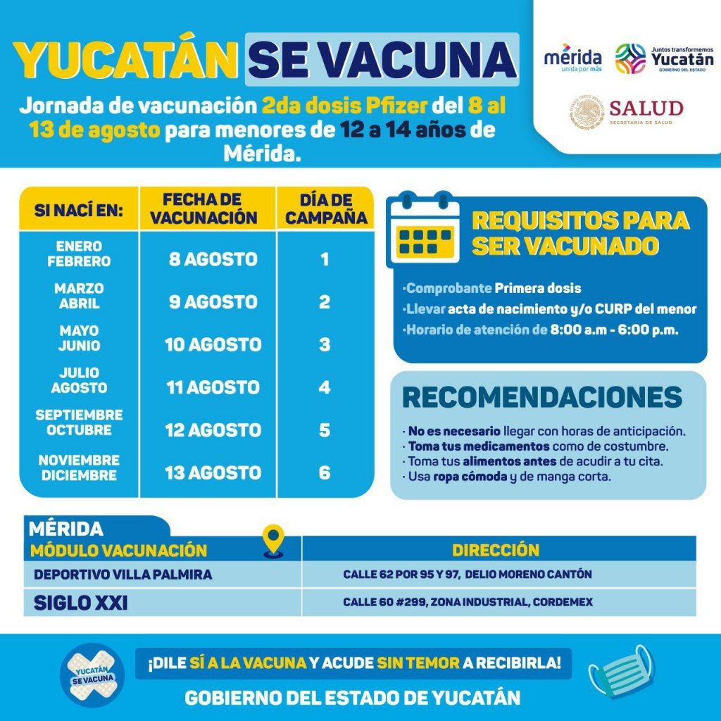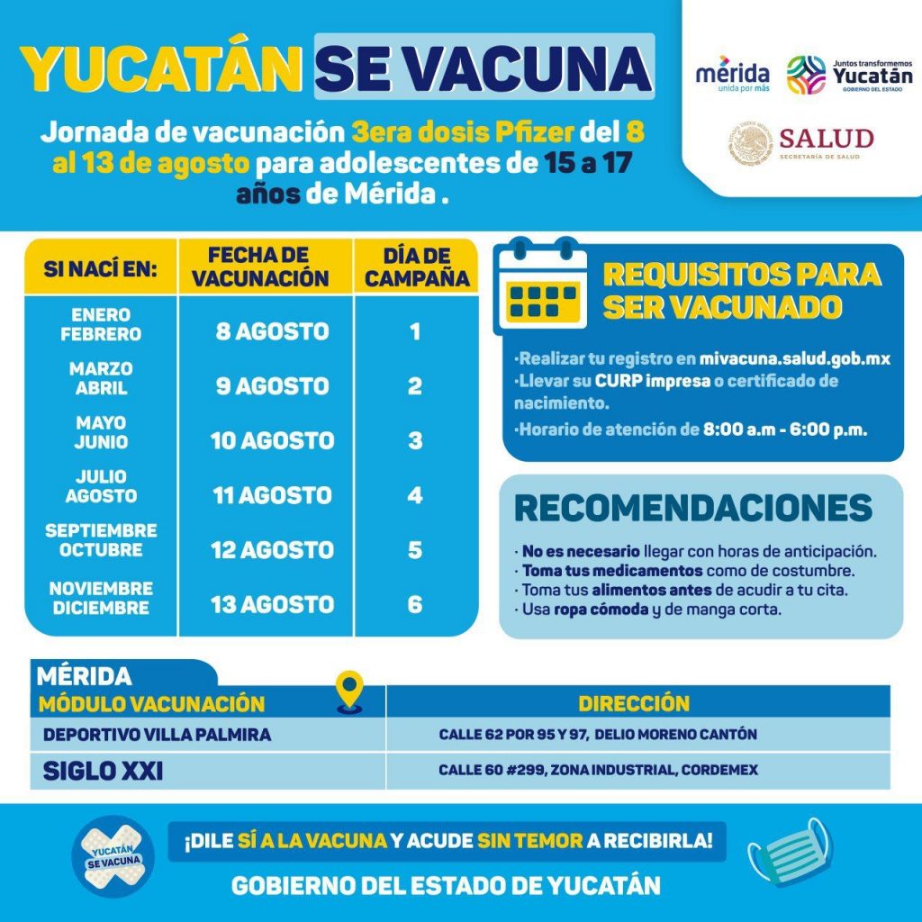 Mérida, Yucatán, 2 de agosto de 2022.- A partir del próximo lunes 8 al sábado 13 de agosto se llevará a cabo una nueva fase de la vacunación contra el Coronavirus en Yucatán, por lo que se aplicarán las segundas dosis para adolescentes de 12 a 14 y tercera dosis para jóvenes de 15 a 17 años de Mérida, informaron las Secretarías de Salud del estado (SSY) y del Bienestar.