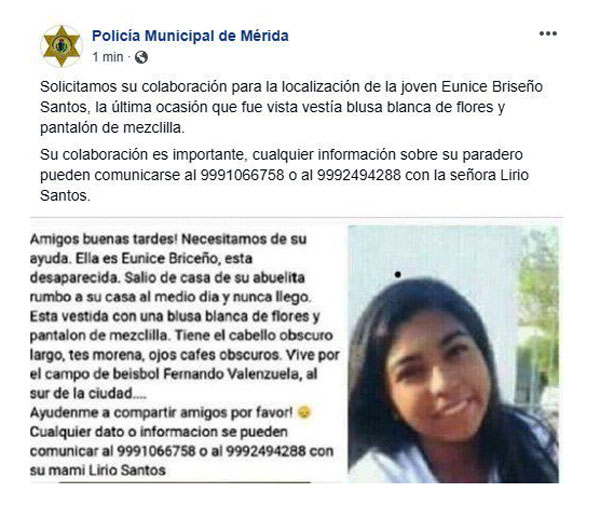 Mérida, Yucatán a 27 de diciembre (Yucatán al Instante). Luego de la intensa búsqueda que implementaron los padres y familiares de la joven Eunice Briceño Santos quien fue reportada como desaparecida en días pasados, la SSP informó este día de su aparición, se encontraba con un familiar en el sur de Mérida.