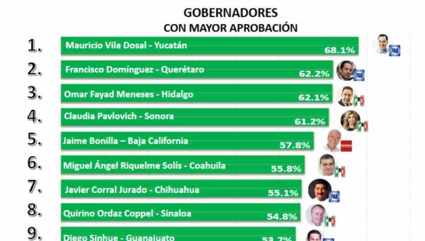 En el top ten de los gobernadores que tienen mayor aprobación aparecen Mauricio Villa Dosal, de Yucatán con un 68.1%, en segundo lugar aparece Francisco Domínguez, de Querétaro con un 62.2% y en tercer sitio está Omar Fayad, de Hidalgo con un 62.1%.
