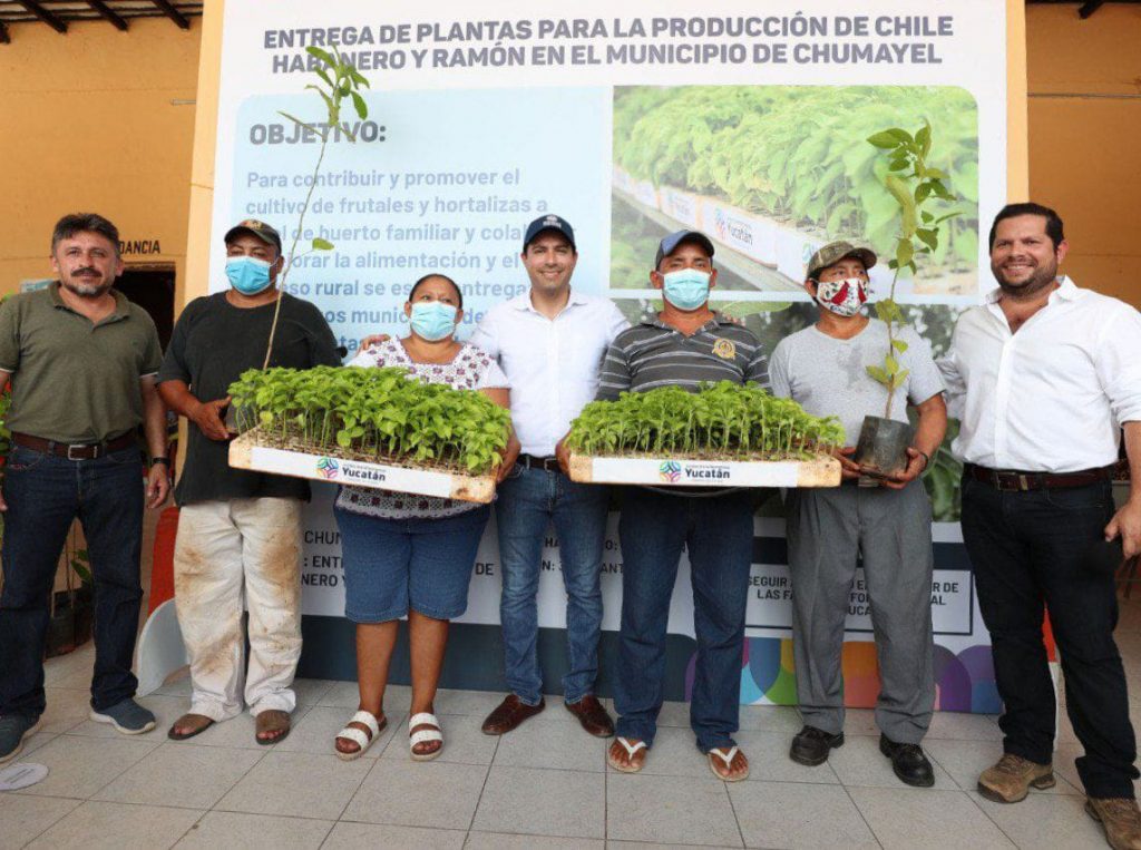Como parte de su actividad en dicha localidad, el Gobernador, acompañado del titular de la Secretaría de Desarrollo Rural (Seder), Jorge Díaz Loeza, dio seguimiento a la entrega de un total de 45 mil plantas de chile habanero en la entidad. En Chumayel repartieron mil plantas para fortalecer los huertos familiares y contribuir a mejorar la alimentación en los hogares de las comunidades.