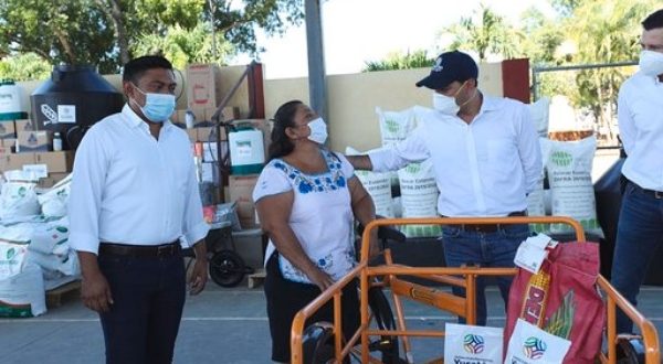 En gira de trabajo por el municipio de Opichén, Vila Dosal distribuyó estas ayudas para hombres y mujeres que se dedican a la agricultura, ganadería y apicultura, quienes siguen trabajando para levantar de nuevo sus unidades de producción luego del paso de las tormentas tropicales “Amanda”, Cristóbal”, “Gamma” y el huracán “Delta”.