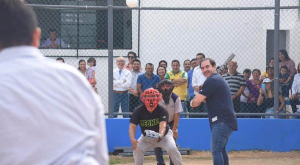 Después del acto protocolario, el alcalde dio el batazo inaugural, acompañado del Director de Desarrollo Urbano y Obras Públicas, Luis Alberto Castro Naal, quien fungió como pitcher y del catcher José Cereso.