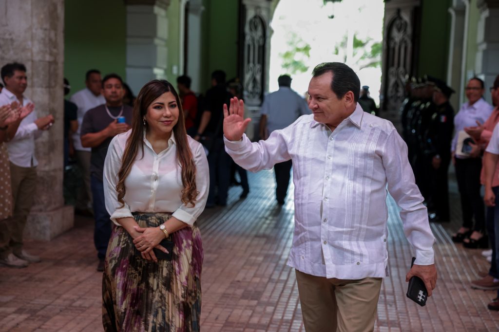Acompañado de los integrantes de su Gabinete, así como de la presidenta honoraria del Sistema para el Desarrollo Integral de la Familia (DIF) Yucatán, la maestra Wendy Méndez Naal, el Mandatario estatal refrendó que el patio central del Palacio de Gobierno vuelve a tener vida, ya que durante mucho tiempo estuvo cerrado al pueblo, pero ahora vuelve a ser la casa donde todas y todos los yucatecos son escuchados y atendidos.