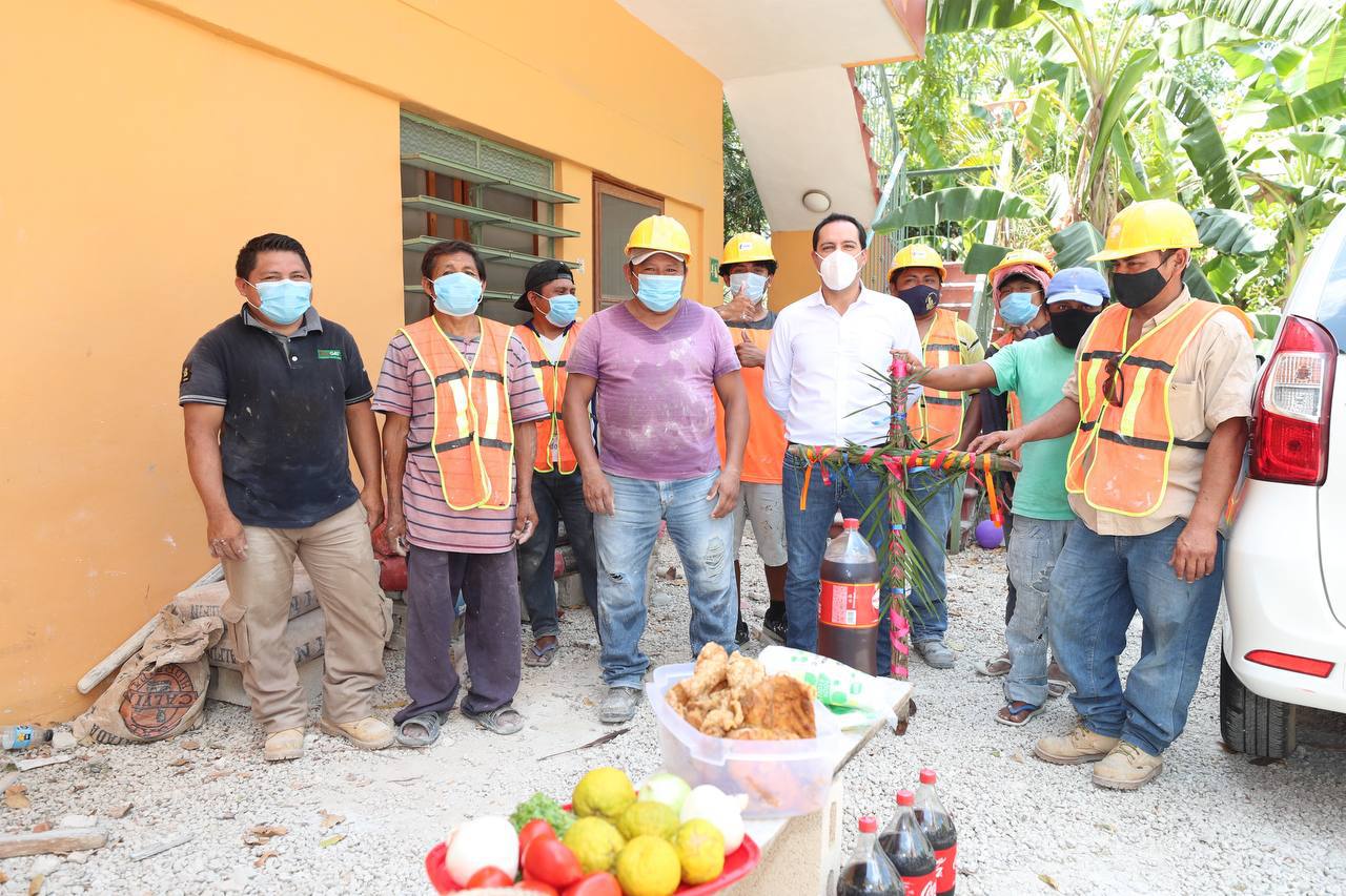 Luego de supervisar el inicio de la vacunación a personas de 50 a 59 en el módulo habilitado en el local de la Cámara Nacional de Comercio y Servicios Turísticos (Canaco Servytur) delegación Valladolid, Vila Dosal acudió a una obra que se lleva a cabo en el barrio de San Juan de esta ciudad, a donde llegó para compartir los alimentos con los alarifes.