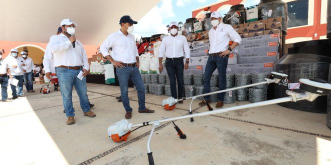 En Ticul se benefició a 232 productores con la entrega de tinacos, alambre de púas, equipos apícolas, fertilizantes, bombas para sacar agua, manguera, desbrozadoras, carretillas, motobombas y triciclos, que son insumos necesarios para la actividad y que impulsan la reactivación de las tierras, así como los empleos que generan a miles de mujeres y hombres trabajadores.