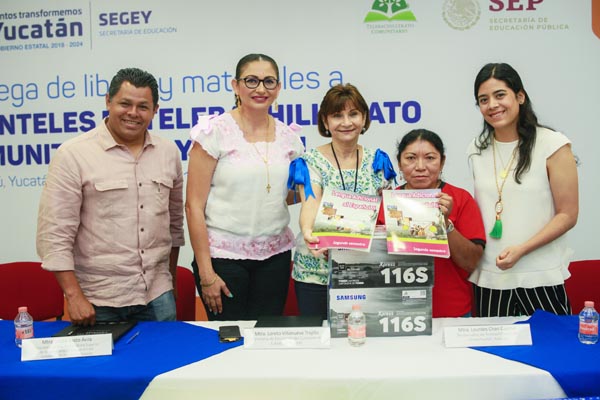 Luego, acompañada por el coordinador de los TBC, José Sánchez Baeza, Villanueva Trujillo distribuyó textos y material de apoyo al estudiantado de los planteles de Halachó, Kopomá, Opichén y Maxcanú. En total se beneficiará a 12 comisarías del poniente y a 36 del sur.