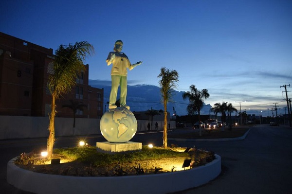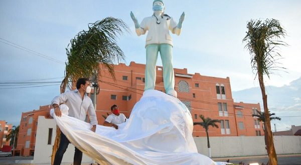 Respecto a los trabajos en dicha rotonda, se llevó a cabo la reforestación, reparación de guarniciones y banquetas, la rehabilitación del alumbrado y la instalación de la escultura, la cual mide 4 metros de altura, y fue tallada en aglomerado con estructura metálica en base y cuerpo, fue recubierta de fibra de vidrio con seis capas, también fue pulida y revestida para su larga duración con pintura automotriz y barniz poliuretano en cuatro capas, y es acompañada de una placa que hace referencia a la actual contingencia. Todo lo anterior gracias a las gestiones del edil con la iniciativa privada.