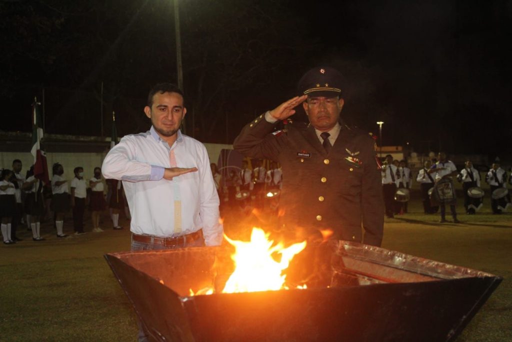 Al sonido de las trompetas y los tambores el alcalde junto al Teniente Coronel de Infantería Miguel Angel Santiago Juarez procedieron a la incineracion de las banderas, en acto seguido el Coronel de Fuerza Área Piloto Aviador, Hilario Feliz Santiago Hernández dió lectura a la toma de protesta de abanderamiento.