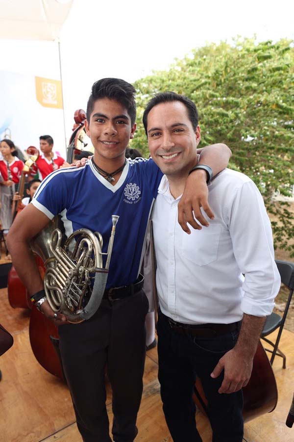 Jesús Gregorio y sus compañeros interpretaron varias melodías ante el Gobernador Mauricio Vila Dosal, quien visitó el plantel, ubicado en Ciudad Caucel. Ahí vio los avances de los jóvenes músicos y conoció la historia de los integrantes de esta orquesta.