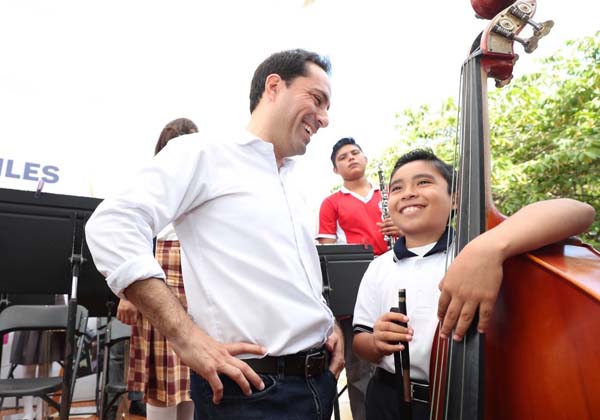 El Gobernador también platicó con Gabriela Alessandra Ramón Ramírez, quien toca la viola. Ella le contó a Vila Dosal que se encuentra muy contenta de lo mucho que ha aprendido en estos primeros meses de práctica, pues sabe que todo el esfuerzo que ahora está realizando se verá reflejado en muchos logros en el futuro y buenas experiencias.