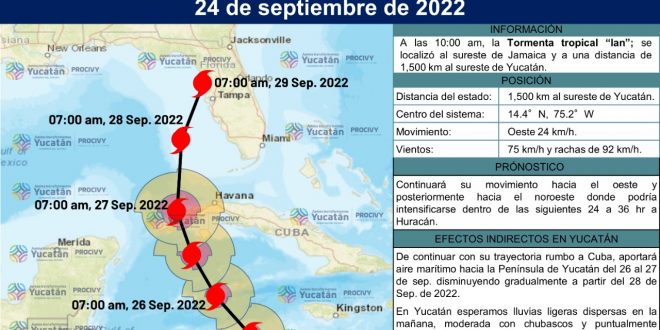 Mérida, Yucatán, 24 de septiembre de 2022.- La ahora tormenta tropical Ian se localiza al sureste de Jamaica, a mil 500 kilómetros (Km) de Yucatán, la Coordinación Estatal de Protección Civil (Procivy) mantiene en vigilancia el ciclón tropical, en seguimiento a la instrucción del Gobernador Mauricio Vila Dosal, de mantener su monitoreo permanente e informar a la población.