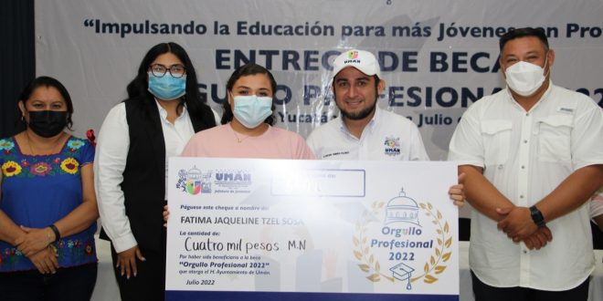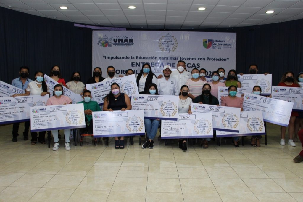 Uman, Yucatán a 16 de julio de 2022.- Un total de 41 jóvenes de la Ciudad Capital de las Industrias recibieron becas del programa “Orgullo Profesional 2022” que otorga el Ayuntamiento de Umán a estudiantes que están por terminar sus estudios universitarios para que puedan titularse.