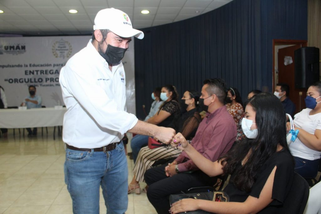 Lic. Raúl Carrillo Seguro, Subsecretario de la Juventud del Gobierno del Estado de Yucatán, invitado especial a la ceremonia de entrega de becas, reconoció que este programa es un “motor” para quienes están finalizando sus estudios y no cuentan con los recursos suficientes para titularse, por lo que felicitó a la actual Comuna umanense por apostarle a la profesionalización de los jóvenes y seguir poniendo el ejemplo en acciones que benefician a los habitantes.