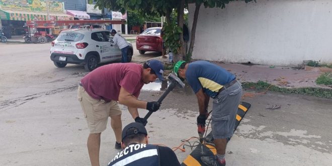 Progreso, Yucatán, 23 de septiembre de 2025.-Luego de que vecinas y vecinos de Flamboyanes solicitaran apoyo para reforzar la seguridad vial en la zona, el alcalde Erik Rihani González, a través de la Dirección de Transporte y Movilidad Urbana, inició la instalación de reductores de velocidad y señaléticas en varias calles de la comisaría.
