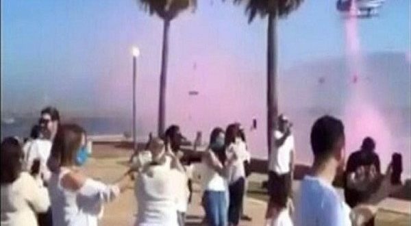 En los videos compartidos por la misma joven, se observa a un grupo de personas, entre las que inclusive hay menores de edad, parados frente a las distintivas letras del puerto, sin cubrebocas y sin guardar la sana distancia mientras un helicóptero lanza un humo de color rosa.