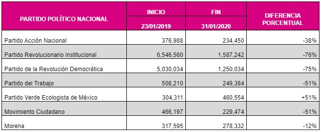 El documento señala que, con corte al 31 de enero de 2020, los padrones de afiliadas y afiliados de todos los partidos políticos nacionales se encontraban consolidados y quedaron conformados como se ilustra en el siguiente cuadro, que incluye el número de militantes al inicio y al final del procedimiento de revisión, actualización y sistematización.