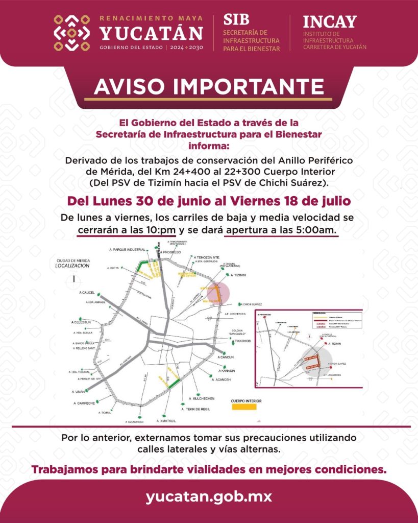 Como parte del mismo programa de mantenimiento vial, el Incay anunció que continuará con trabajos en el cuerpo interior del periférico, del kilómetro 24+400 al 22+300, es decir, desde el PSV de Tizimín hasta el PSV de Chichí Suárez.