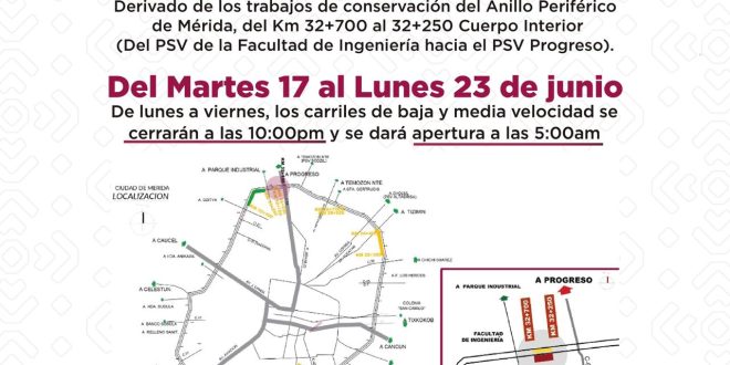 Asimismo, da a conocer que, como parte del programa de conservación del Anillo Periférico de Mérida, se continuará con la intervención en el cuerpo interior en el tramo comprendido del kilómetro 32+700 al 32+250, en sentido de la Facultad de Ingeniería hacia el PSV Progreso.