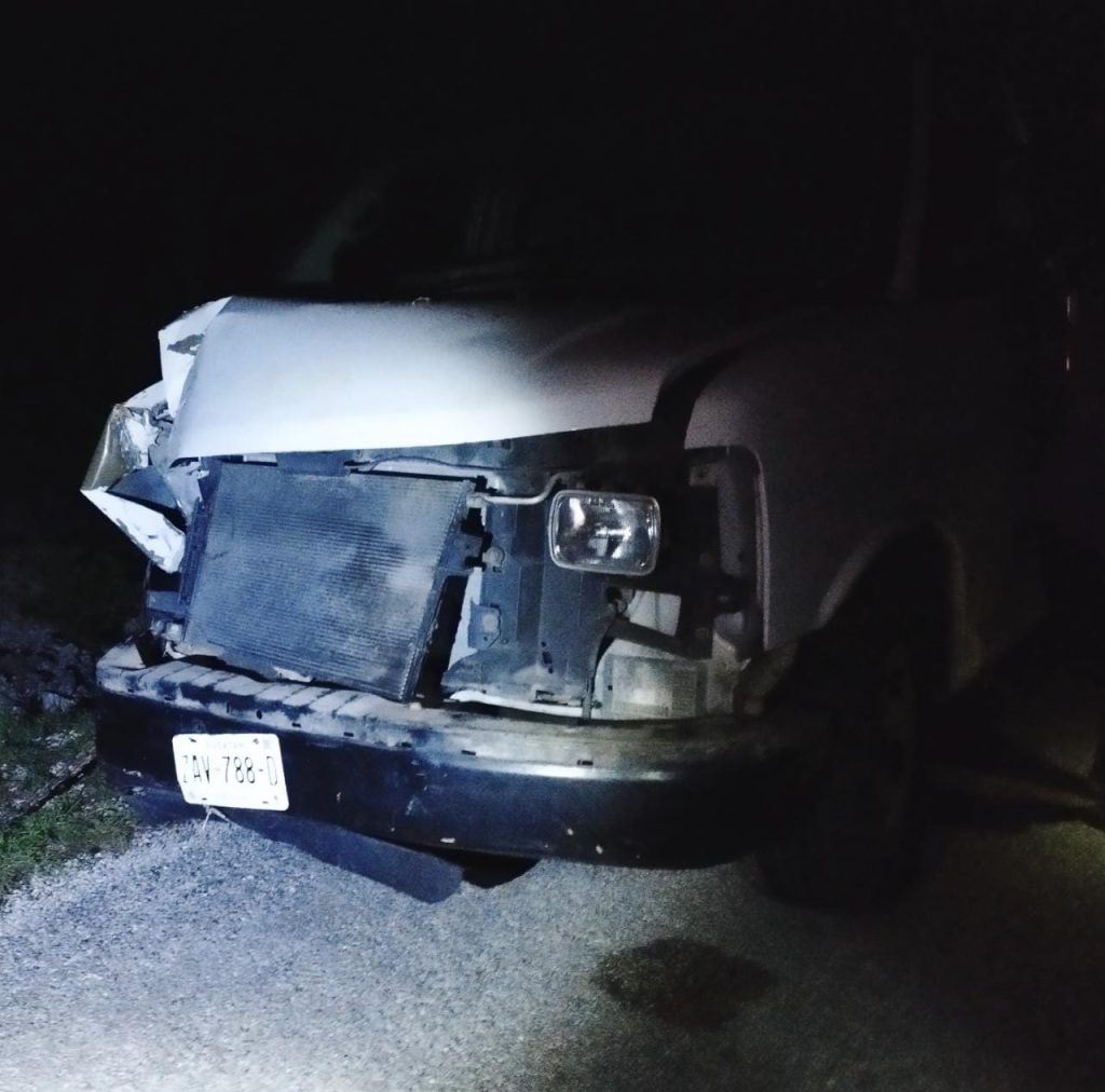 Samahil, Yuc., a 29 de mayo 2023.- Una Van tuvo una fuerte salida al monte tras pinchar una llanta y acabar reventándose contra un árbol en la vía intercomisarías Tamchén-Tedzidz, la noche de ayer.