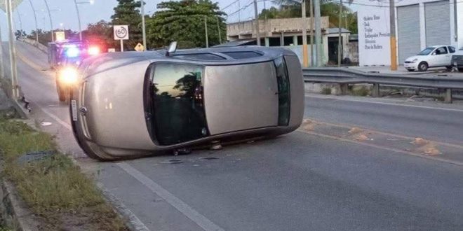 KANASÍN, Yuc., 27 de agosto 2025.- En las primeras horas de este lunes, un automóvil Volkswagen Gol terminó volcando al bajar el puente de Tixkokob. De acuerdo con los reportes, el conductor dio el clásico pestañazo, subió al camellón central y perdió el control del vehículo.