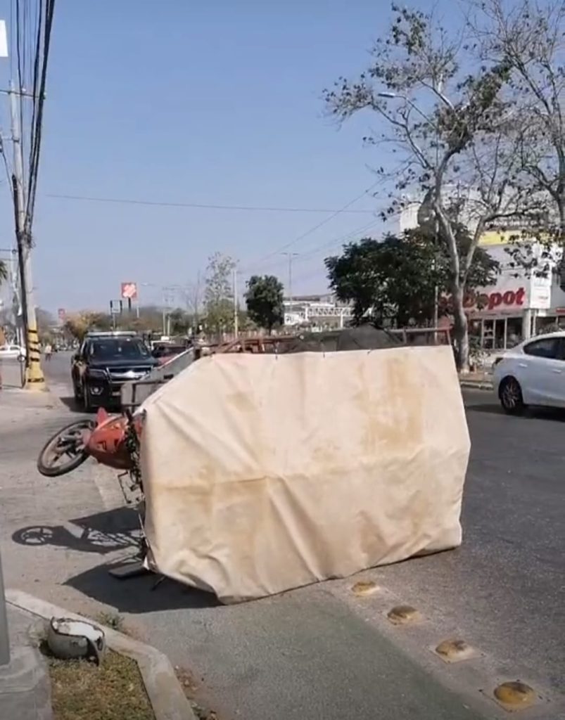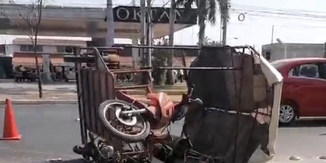 El golpe hizo volcar al motocarro de costado izquierdo, el cual derrapo por varios metros y se detuvo en la esquina.