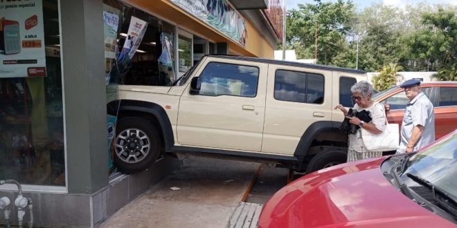 Mérida, Yucatán, 6 de agosto de 2025.- Un aparatoso accidente ocurrió este miércoles por la mañana en el Periférico de Mérida, a la altura de la salida a Motul, luego de que una conductora confundiera los pedales de su camioneta y estuviera a punto de incrustarse en un Oxxo.