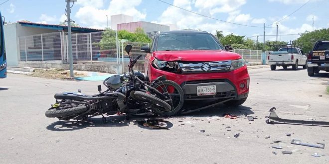 MÉRIDA, Yuc., 16 de agosto de 2025.- Un aparatoso accidente se registró esta tarde en la colonia Emiliano Zapata Sur III, luego de que la conductora de una camioneta Suzuki invadiera el carril de preferencia y atropellara a dos motociclistas.