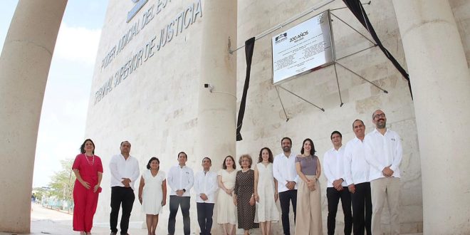 A las puertas de la sede del Poder Judicial del Estado, en la avenida Canek, Canto Valdés y los demás magistrados descubrieron la placa que deja constancia de los dos siglos de existencia de esta institución de impartición de justicia.