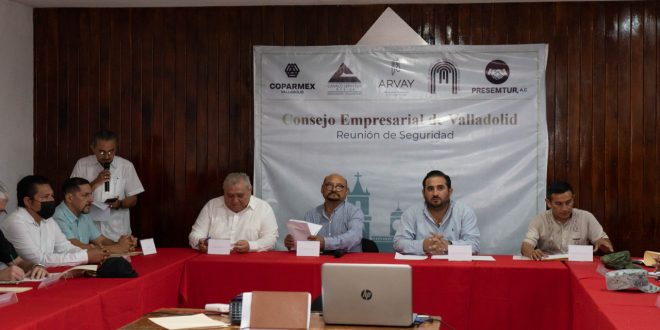 Valladolid, Yucatán, a 8 de noviembre de 2022.- Con el objetivo de abordar temas relacionados con la paz y tranquilidad en el municipio, el Consejo Empresarial de Valladolid integrado por Coparmex, Canaco Servytur, Asociación de Restaurantes de Valladolid ARVAY A.C., Asociación de Hoteles y Hostales de Valladolid A.C., y Presemtur A.C., llevó a cabo la primera reunión de seguridad, con la participación de autoridades gubernamentales en la materia.