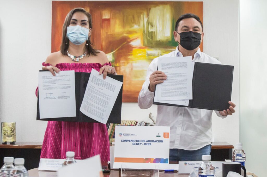 La firma de este convenio, que se realizó en la SEGEY, fue encabezada por la titular del IMSS, doctora Miriam Victoria Sánchez Castro y el secretario de Educación del Estado de Yucatán, Liborio Vidal Aguilar.