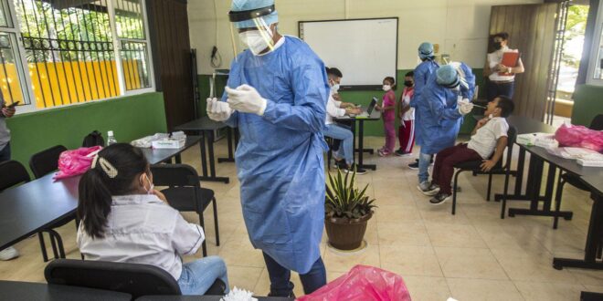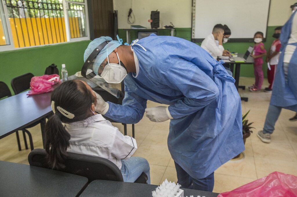 Tepakán, Yucatán, 17 de marzo de 2022.- Alumnos y docentes de planteles de nivel básico en 3 municipios participaron en la aplicación de pruebas aleatorias para detectar casos de Coronavirus y romper cadenas de contagios, como parte del Protocolo de Muestreo en Escuelas para Detección Oportuna de Covid-19, que busca generar confianza en estudiantes y padres de familia para continuar con el retorno seguro a clases presenciales y, con ello, evitar el rezago educativo.