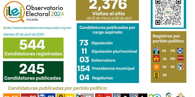 Mérida, Yucatán, 30 de abril de 2024.- Más de 2 mil 300 personas han ingresado o descargado información del Observatorio Electoral Ilej promovido por el Instituto Estatal de Transparencia, Acceso a la Información Pública y Protección de Datos Personales (Inaip Yucatán) y el Comité de Participación Ciudadana del Sistema Estatal Anticorrupción quienes reiteraron la invitación a conocer esta Plataforma.