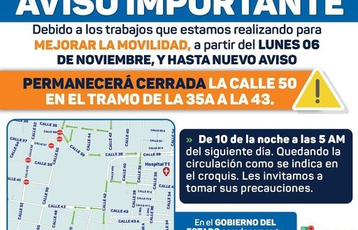 Mérida, Yucatán, 6 de noviembre de 2023.- Como parte de los trabajos para mejorar la movilidad en Yucatán, a partir del lunes 6 de noviembre se cerrará parcialmente al tránsito vehicular la calle 50, en el tramo que va de la 35-A a la 43 de esta ciudad, en un horario de 10 de la noche a 5 de la mañana del siguiente día, por lo que se hace un llamado a tomar sus previsiones para quienes acostumbran circular por esa zona.